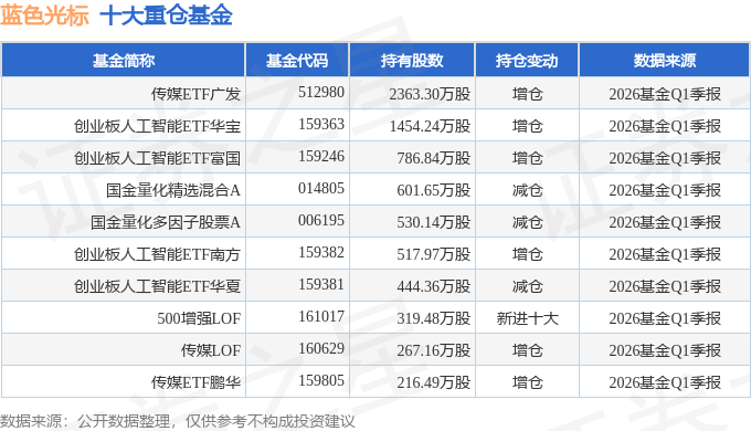 持有蓝色光标最多的基金为传媒ETF广发,目前规模为52.1亿元,最新净值1.0247(4月23日),较上一交易日下跌0.84%,近一年上涨30.14%。该基金现任基金经理为罗国庆。