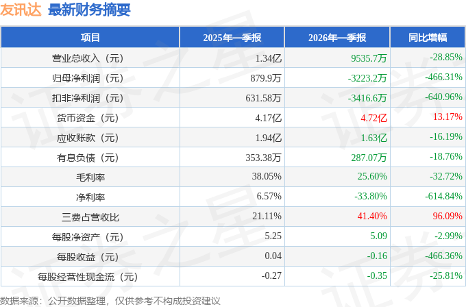 据证券之星公开数据整理,近期友讯达(300514)发布2026年一季报。截至本报告期末,公司营业总收入9535.7万元,同比下降28.85%,归母净利润-3223.2万元,同比下降466.31%。按单季度数据看,第一季度营业总收入9535.7万元,同比下降28.85%,第一季度归母净利润-3223.2万元,同比下降466.31%。本报告期友讯达三费占比上升明显,财务费用、销售费用和管理费用总和占总营收同比增幅达96.09%。