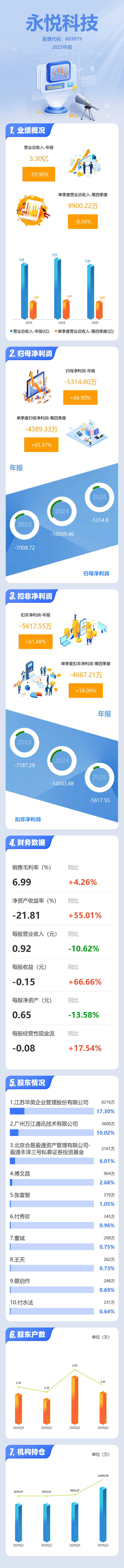 证券之星消息,永悦科技2025年年报显示,当年度公司主营收入3.3亿元,同比下降10.96%;归母净利润-5314.8万元,同比上升66.91%;扣非净利润-5617.55万元,同比上升61.48%;其中2025年第四季度,公司单季度主营收入9900.22万元,同比下降8.07%;单季度归母净利润-4389.33万元,同比上升65.37%;单季度扣非净利润-4667.21万元,同比上升58.1%;负债率12.61%,投资收益-26.55万元,财务费用6.71万元,毛利率6.99%。
