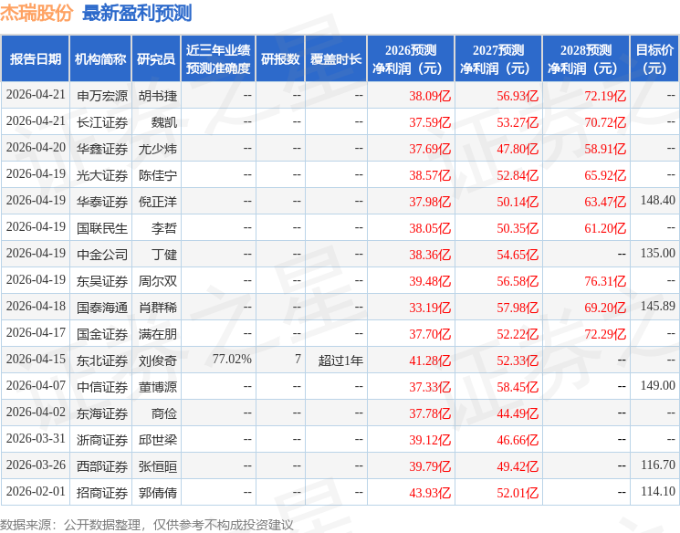 证券之星数据中心根据近三年发布的研报数据计算,东北证券刘俊奇研究员团队对该股研究较为深入,近三年预测准确度均值为77.02%,其预测2026年度归属净利润为盈利41.28亿,根据现价换算的预测PE为32.51。