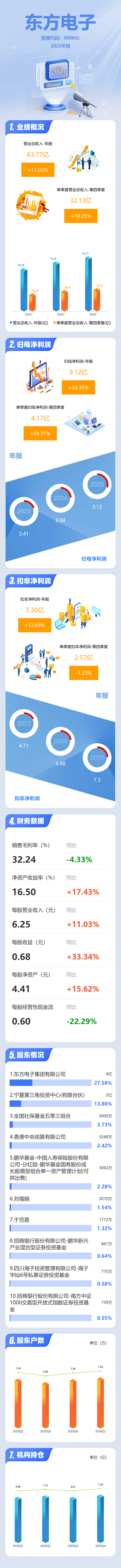 证券之星消息,东方电子2025年年报显示,当年度公司主营收入83.77亿元,同比上升11.04%;归母净利润9.12亿元,同比上升33.35%;扣非净利润7.3亿元,同比上升12.69%;其中2025年第四季度,公司单季度主营收入32.13亿元,同比上升10.25%;单季度归母净利润4.17亿元,同比上升58.71%;单季度扣非净利润2.57亿元,同比下降1.24%;负债率54.27%,投资收益1481.7万元,财务费用-8009.09万元,毛利率32.24%。