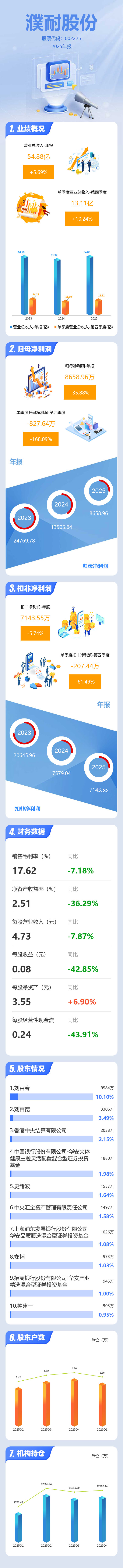 证券之星消息,濮耐股份2025年年报显示,当年度公司主营收入54.88亿元,同比上升5.69%;归母净利润8658.96万元,同比下降35.89%;扣非净利润7143.55万元,同比下降5.75%;其中2025年第四季度,公司单季度主营收入13.11亿元,同比上升10.24%;单季度归母净利润-827.64万元,同比下降168.1%;单季度扣非净利润-207.44万元,同比下降61.49%;负债率53.28%,投资收益1400.24万元,财务费用4768.02万元,毛利率17.62%。