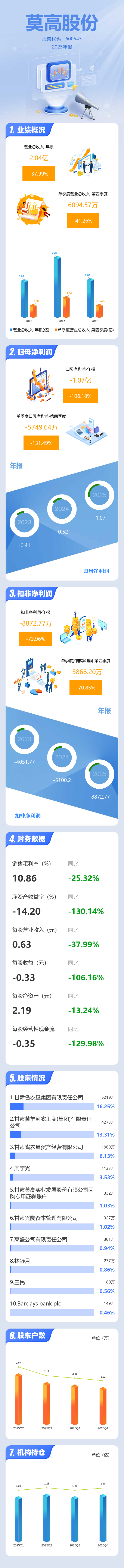 证券之星消息,莫高股份2025年年报显示,当年度公司主营收入2.04亿元,同比下降38.0%;归母净利润-1.07亿元,同比下降106.18%;扣非净利润-8872.77万元,同比下降73.97%;其中2025年第四季度,公司单季度主营收入6094.57万元,同比下降41.26%;单季度归母净利润-5749.64万元,同比下降131.49%;单季度扣非净利润-3868.2万元,同比下降70.86%;负债率27.94%,投资收益-83.69万元,财务费用185.65万元,毛利率10.86%。