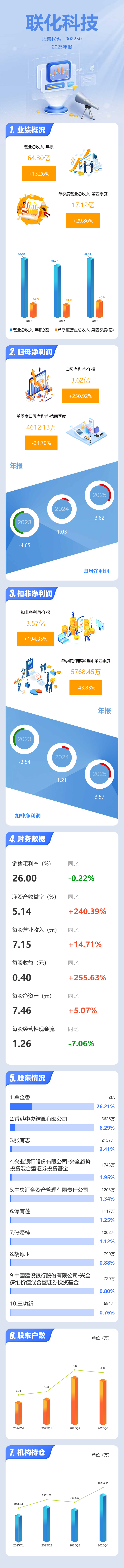 证券之星消息,联化科技2025年年报显示,当年度公司主营收入64.3亿元,同比上升13.27%;归母净利润3.62亿元,同比上升250.93%;扣非净利润3.57亿元,同比上升194.36%;其中2025年第四季度,公司单季度主营收入17.12亿元,同比上升29.87%;单季度归母净利润4612.13万元,同比下降34.7%;单季度扣非净利润5768.45万元,同比下降43.84%;负债率47.6%,投资收益-285.27万元,财务费用1999.64万元,毛利率26.0%。