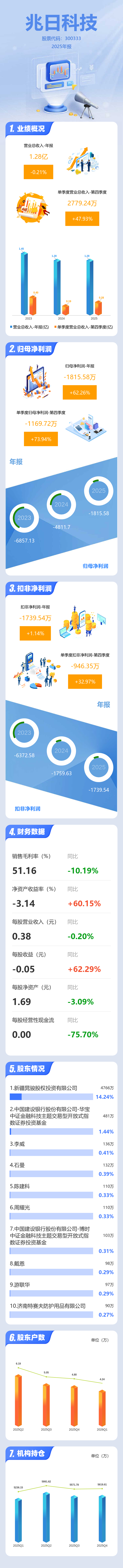 证券之星消息,兆日科技2025年年报显示,当年度公司主营收入1.28亿元,同比下降0.21%;归母净利润-1815.58万元,同比上升62.27%;扣非净利润-1739.54万元,同比上升1.14%;其中2025年第四季度,公司单季度主营收入2779.24万元,同比上升47.94%;单季度归母净利润-1169.72万元,同比上升73.95%;单季度扣非净利润-946.35万元,同比上升32.98%;负债率3.01%,投资收益434.48万元,财务费用86.91万元,毛利率51.16%。