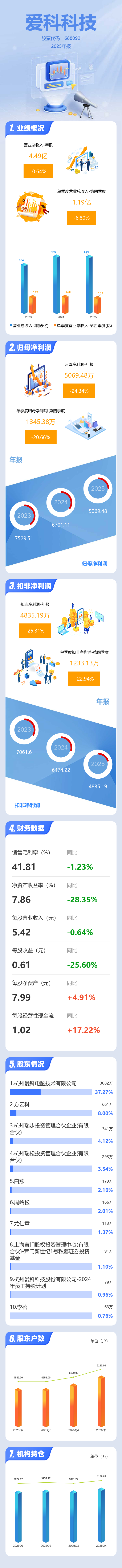 证券之星消息,爱科科技2025年年报显示,当年度公司主营收入4.49亿元,同比下降0.65%;归母净利润5069.48万元,同比下降24.35%;扣非净利润4835.19万元,同比下降25.32%;其中2025年第四季度,公司单季度主营收入1.19亿元,同比下降6.81%;单季度归母净利润1345.38万元,同比下降20.67%;单季度扣非净利润1233.13万元,同比下降22.94%;负债率19.6%,投资收益150.11万元,财务费用-666.71万元,毛利率41.81%。
