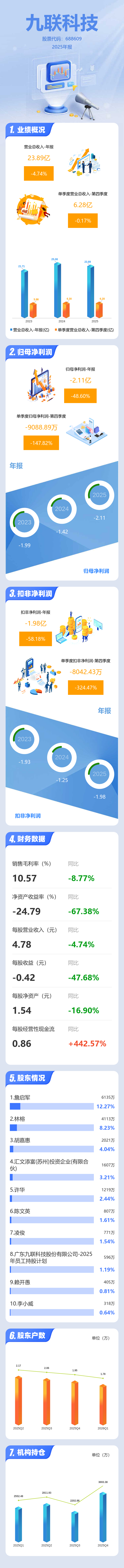 证券之星消息,九联科技2025年年报显示,当年度公司主营收入23.89亿元,同比下降4.74%;归母净利润-2.11亿元,同比下降48.6%;扣非净利润-1.98亿元,同比下降58.18%;其中2025年第四季度,公司单季度主营收入6.28亿元,同比下降0.17%;单季度归母净利润-9088.89万元,同比下降147.83%;单季度扣非净利润-8042.43万元,同比下降324.47%;负债率78.13%,投资收益28.7万元,财务费用4474.23万元,毛利率10.57%。