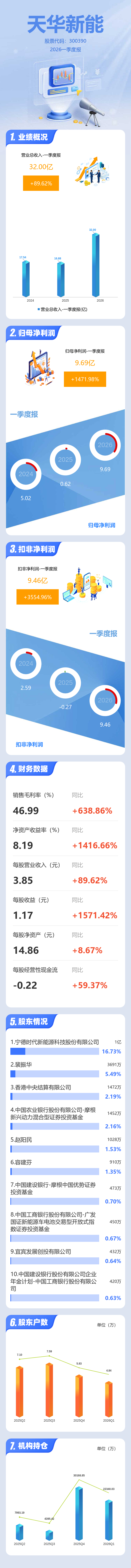 证券之星消息,天华新能2026年一季报显示,一季度公司主营收入32.0亿元,同比上升89.62%;归母净利润9.69亿元,同比上升1471.98%;扣非净利润9.46亿元,同比上升3554.97%;负债率34.68%,投资收益9567.6万元,财务费用2183.95万元,毛利率46.99%。