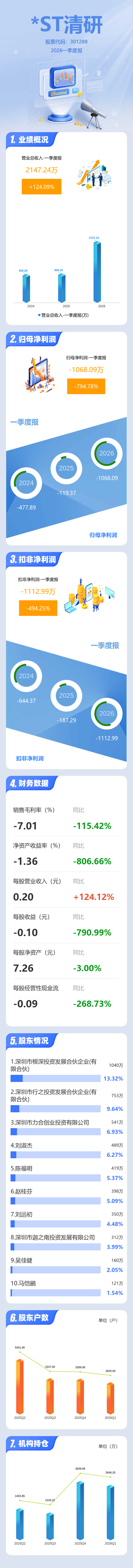 证券之星消息,*ST清研2026年一季报显示,一季度公司主营收入2147.24万元,同比上升124.1%;归母净利润-1068.09万元,同比下降794.78%;扣非净利润-1112.99万元,同比下降494.26%;负债率20.23%,投资收益45.28万元,财务费用-46.91万元,毛利率-7.01%。