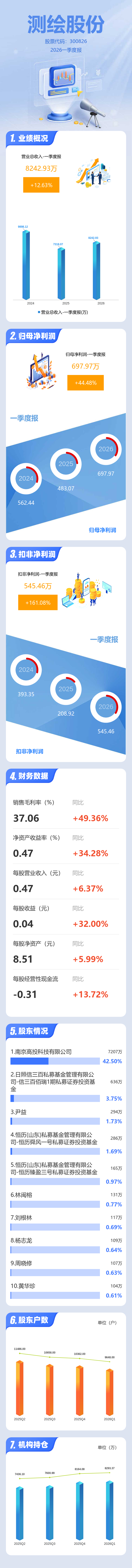 证券之星消息,测绘股份2026年一季报显示,一季度公司主营收入8242.93万元,同比上升12.64%;归母净利润697.97万元,同比上升44.49%;扣非净利润545.46万元,同比上升161.08%;负债率39.08%,投资收益92.39万元,财务费用-47.32万元,毛利率37.06%。