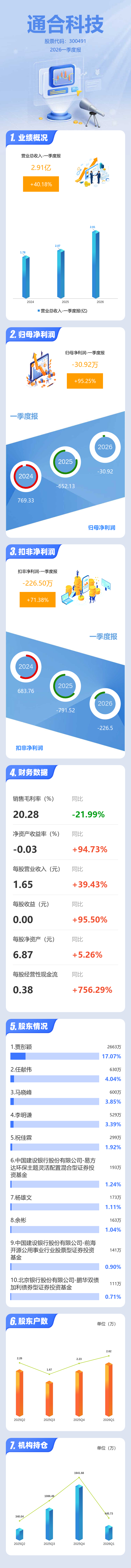 证券之星消息,通合科技2026年一季报显示,一季度公司主营收入2.91亿元,同比上升40.19%;归母净利润-30.92万元,同比上升95.26%;扣非净利润-226.5万元,同比上升71.38%;负债率52.33%,财务费用250.06万元,毛利率20.28%。