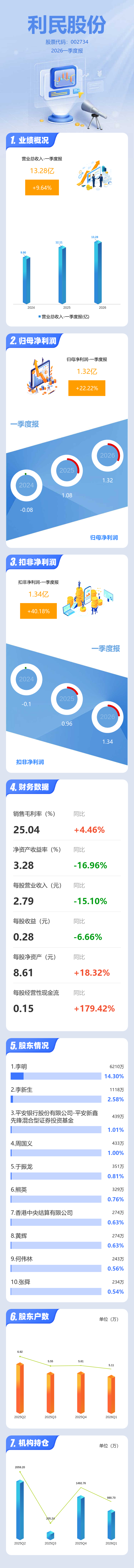 证券之星消息,利民股份2026年一季报显示,一季度公司主营收入13.28亿元,同比上升9.65%;归母净利润1.32亿元,同比上升22.23%;扣非净利润1.34亿元,同比上升40.18%;负债率37.6%,投资收益2058.34万元,财务费用1259.44万元,毛利率25.04%。