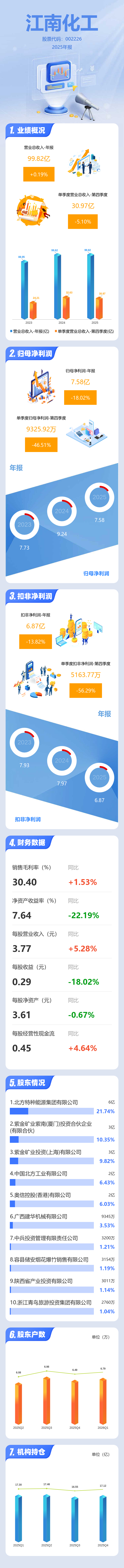 证券之星消息,江南化工2025年年报显示,当年度公司主营收入99.82亿元,同比上升0.2%;归母净利润7.58亿元,同比下降18.02%;扣非净利润6.87亿元,同比下降13.82%;其中2025年第四季度,公司单季度主营收入30.97亿元,同比下降5.11%;单季度归母净利润9325.92万元,同比下降46.51%;单季度扣非净利润5163.77万元,同比下降56.3%;负债率46.39%,投资收益1656.68万元,财务费用1.27亿元,毛利率30.4%。