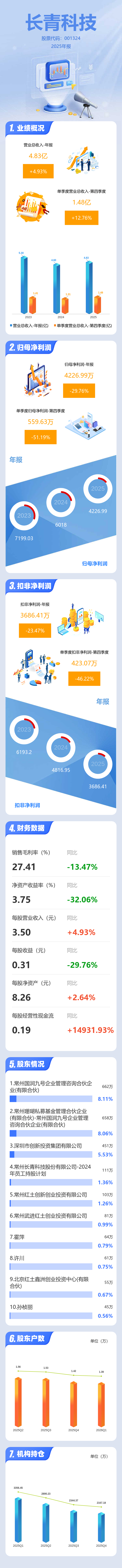 证券之星消息,长青科技2025年年报显示,当年度公司主营收入4.83亿元,同比上升4.94%;归母净利润4226.99万元,同比下降29.76%;扣非净利润3686.41万元,同比下降23.47%;其中2025年第四季度,公司单季度主营收入1.48亿元,同比上升12.76%;单季度归母净利润559.63万元,同比下降51.2%;单季度扣非净利润423.07万元,同比下降46.22%;负债率18.48%,投资收益44.5万元,财务费用-465.91万元,毛利率27.41%。