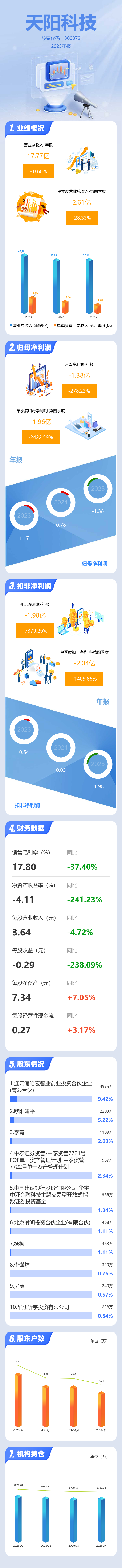 证券之星消息,天阳科技2025年年报显示,当年度公司主营收入17.77亿元,同比上升0.6%;归母净利润-1.38亿元,同比下降278.23%;扣非净利润-1.98亿元,同比下降7379.27%;其中2025年第四季度,公司单季度主营收入2.61亿元,同比下降28.34%;单季度归母净利润-1.96亿元,同比下降2422.6%;单季度扣非净利润-2.04亿元,同比下降1409.87%;负债率25.02%,投资收益59.78万元,财务费用322.05万元,毛利率17.8%。