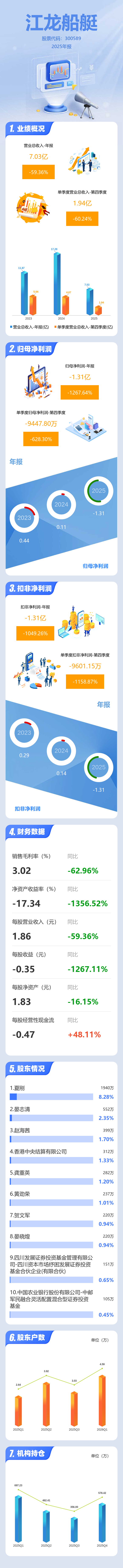证券之星消息,江龙船艇2025年年报显示,当年度公司主营收入7.03亿元,同比下降59.37%;归母净利润-1.31亿元,同比下降1267.65%;扣非净利润-1.31亿元,同比下降1049.26%;其中2025年第四季度,公司单季度主营收入1.94亿元,同比下降60.24%;单季度归母净利润-9447.8万元,同比下降628.31%;单季度扣非净利润-9601.15万元,同比下降1158.88%;负债率65.57%,投资收益-3473.91万元,财务费用373.12万元,毛利率3.02%。