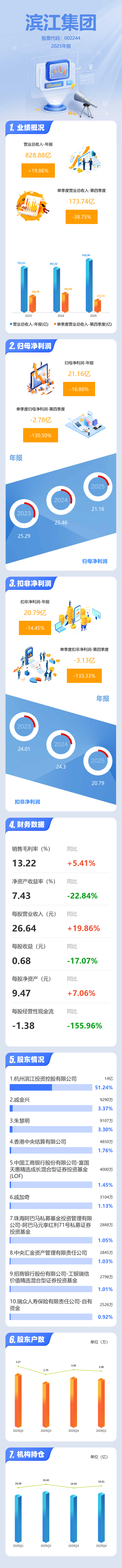 证券之星消息,滨江集团2025年年报显示,当年度公司主营收入828.88亿元,同比上升19.86%;归母净利润21.16亿元,同比下降16.87%;扣非净利润20.79亿元,同比下降14.46%;其中2025年第四季度,公司单季度主营收入173.74亿元,同比下降38.76%;单季度归母净利润-2.78亿元,同比下降130.5%;单季度扣非净利润-3.13亿元,同比下降133.34%;负债率76.41%,投资收益9.26亿元,财务费用4.88亿元,毛利率13.22%。