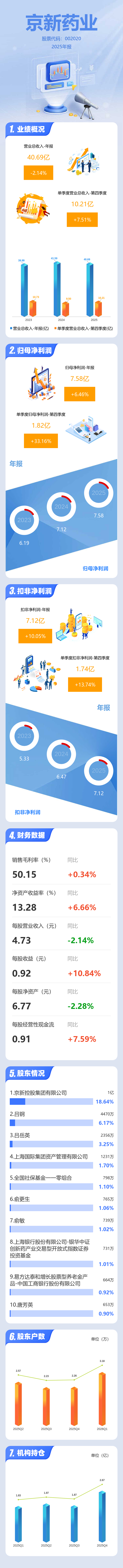 证券之星消息,京新药业2025年年报显示,当年度公司主营收入40.69亿元,同比下降2.14%;归母净利润7.58亿元,同比上升6.46%;扣非净利润7.12亿元,同比上升10.06%;其中2025年第四季度,公司单季度主营收入10.21亿元,同比上升7.51%;单季度归母净利润1.82亿元,同比上升33.16%;单季度扣非净利润1.74亿元,同比上升13.75%;负债率27.74%,投资收益1710.89万元,财务费用-4515.96万元,毛利率50.15%。