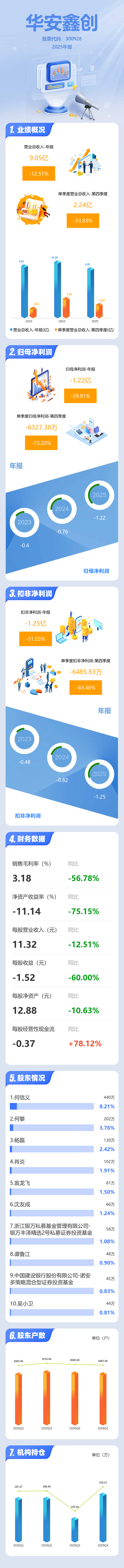 证券之星消息,华安鑫创2025年年报显示,当年度公司主营收入9.05亿元,同比下降12.52%;归母净利润-1.22亿元,同比下降59.92%;扣非净利润-1.25亿元,同比下降51.04%;其中2025年第四季度,公司单季度主营收入2.24亿元,同比下降33.83%;单季度归母净利润-6327.38万元,同比下降73.2%;单季度扣非净利润-6485.83万元,同比下降63.46%;负债率14.19%,投资收益-1161.69万元,财务费用134.67万元,毛利率3.18%。