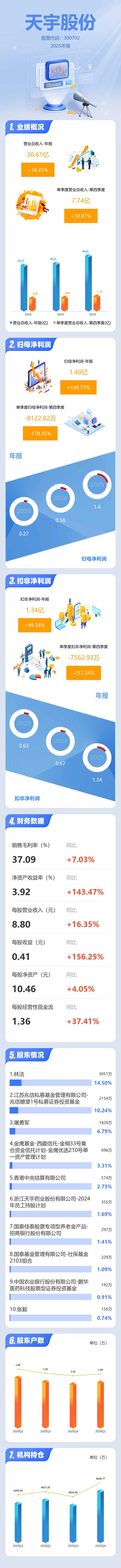 证券之星消息,天宇股份2025年年报显示,当年度公司主营收入30.61亿元,同比上升16.36%;归母净利润1.4亿元,同比上升149.78%;扣非净利润1.34亿元,同比上升99.35%;其中2025年第四季度,公司单季度主营收入7.74亿元,同比上升10.82%;单季度归母净利润-8122.02万元,同比下降178.35%;单季度扣非净利润-7562.93万元,同比下降217.25%;负债率44.76%,投资收益-14.62万元,财务费用3714.32万元,毛利率37.09%。