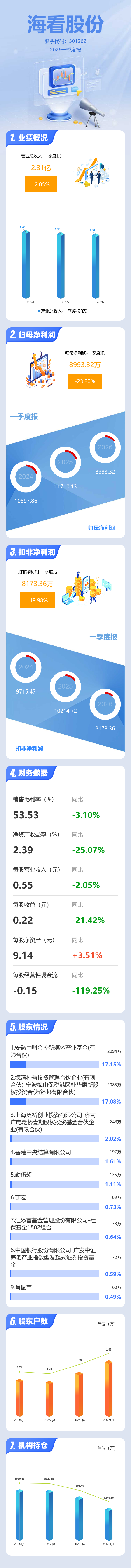 证券之星消息,海看股份2026年一季报显示,一季度公司主营收入2.31亿元,同比下降2.06%;归母净利润8993.32万元,同比下降23.2%;扣非净利润8173.36万元,同比下降19.98%;负债率10.62%,投资收益880.42万元,财务费用-361.5万元,毛利率53.53%。