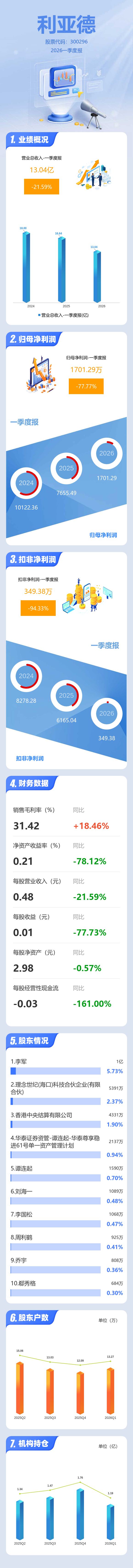 证券之星消息,利亚德2026年一季报显示,一季度公司主营收入13.04亿元,同比下降21.6%;归母净利润1701.29万元,同比下降77.78%;扣非净利润349.38万元,同比下降94.33%;负债率39.8%,投资收益146.87万元,财务费用974.35万元,毛利率31.42%。