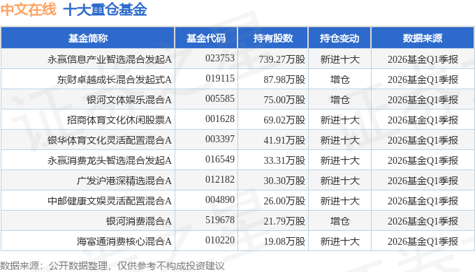 持有中文在线最多的基金为永赢信息产业智选混合发起A,目前规模为3.96亿元,最新净值0.9359(4月23日),较上一交易日上涨0.18%,近一年下跌1.88%。该基金现任基金经理为王文龙。