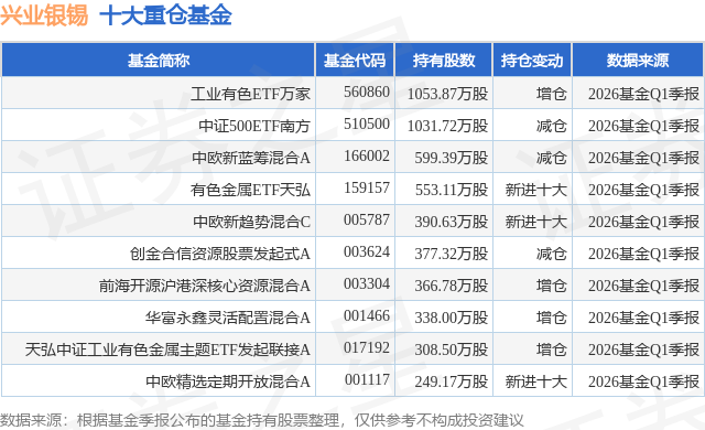 根据2026基金Q1季报公募基金重仓股数据,重仓该股的公募基金共94家,其中持有数量最多的公募基金为万家基金的工业有色ETF万家。工业有色ETF万家目前规模为101.7亿元,最新净值1.7958(4月22日),较上一交易日上涨0.51%,近一年上涨124.47%。该公募基金现任基金经理为贺方舟。贺方舟在任的基金产品包括:万家180指数A,管理时间为2024年4月15日至今,期间收益率为33.43%;万家中证工业有色金属主题ETF发起式联接A,管理时间为2024年11月2日至今,期间收益率为98.33%;航空航天ETF万家,管理时间为2025年4月28日至今,期间收益率为39.32%。