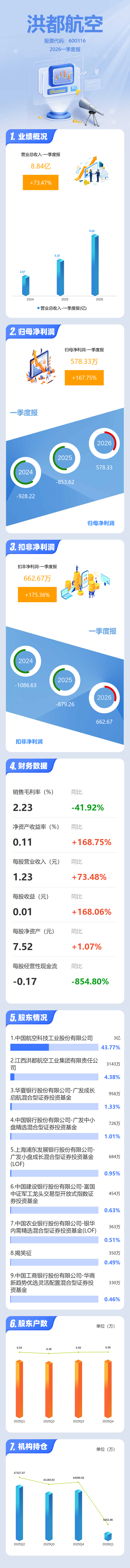 证券之星消息,洪都航空2026年一季报显示,一季度公司主营收入8.84亿元,同比上升73.47%;归母净利润578.33万元,同比上升167.75%;扣非净利润662.67万元,同比上升175.37%;负债率60.72%,投资收益-260.3万元,财务费用-28.13万元,毛利率2.23%。