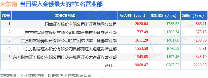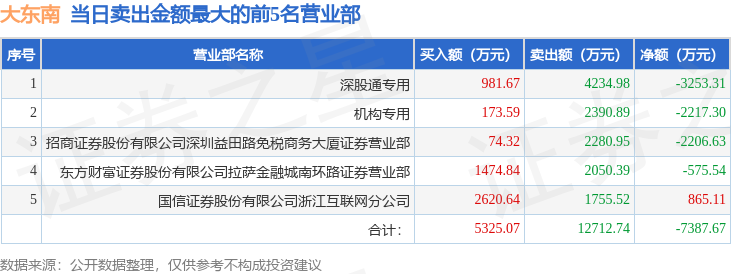 证券之星消息,沪深交易所2026年4月23日公布的交易公开信息显示,大东南(002263)因日跌幅偏离值达到7%的前5只证券登上龙虎榜。此次是近5个交易日内第1次上榜。