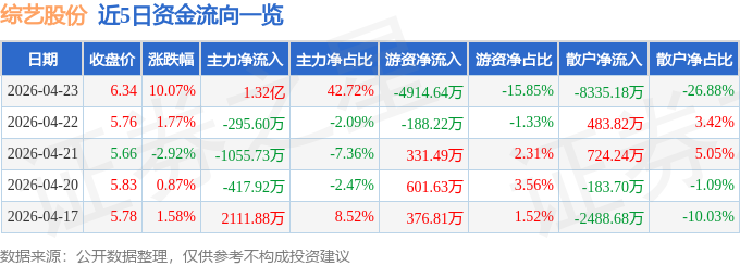 证券之星消息,综艺股份4月23日涨停收盘,收盘价6.34元。该股于9点51分涨停,未打开涨停,截止收盘封单资金为7665.89万元,占其流通市值0.93%。