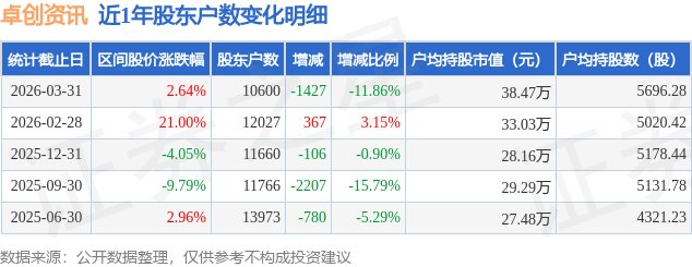 从股价来看,2026年2月28日至2026年3月31日,卓创资讯区间涨幅为2.64%,在此期间股东户数减少1427.0户,减幅为11.86%。