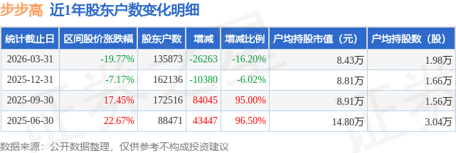 从股价来看,2025年12月31日至2026年3月31日,步步高区间跌幅为19.77%,在此期间股东户数减少2.63万户,减幅为16.2%。