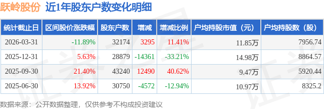 从股价来看,2025年12月31日至2026年3月31日,跃岭股份区间跌幅为11.89%,在此期间股东户数增加3295.0户,增幅为11.41%。