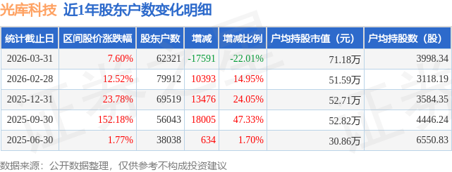 从股价来看,2026年2月28日至2026年3月31日,光库科技区间涨幅为7.6%,在此期间股东户数减少1.76万户,减幅为22.01%。