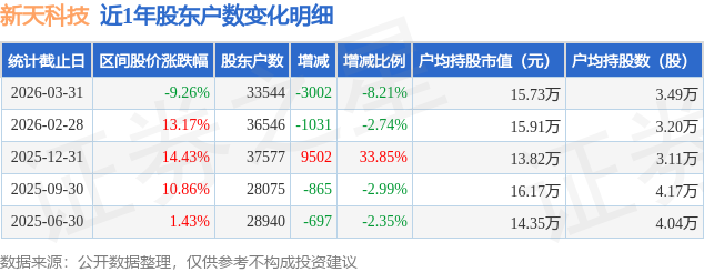 从股价来看,2026年2月28日至2026年3月31日,新天科技区间跌幅为9.26%,在此期间股东户数减少3002.0户,减幅为8.21%。