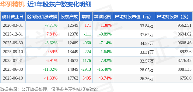 从股价来看,2025年12月31日至2026年3月31日,华研精机区间跌幅为7.71%,在此期间股东户数增加171.0户,增幅为1.38%。