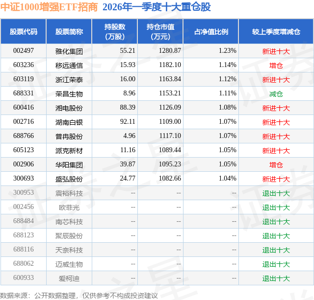 中证1000增强ETF招商的前十大重仓股如下:
