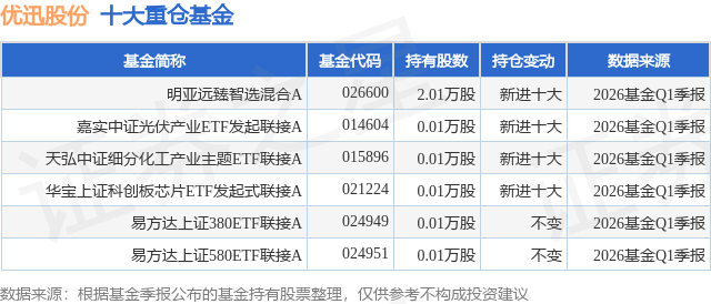 根据2026基金Q1季报公募基金重仓股数据,重仓该股的公募基金共6家,其中持有数量最多的公募基金为明亚基金的明亚远臻智选混合A。明亚远臻智选混合A目前规模为2.25亿元,最新净值0.9665(4月22日),较上一交易日下跌0.06%。该公募基金现任基金经理为何明 韩俏。何明在任的基金产品包括:明亚价值长青混合A,管理时间为2021年11月17日至今,期间收益率为11.91%;明亚中证1000指数增强A,管理时间为2023年4月25日至今,期间收益率为30.47%;明亚稳利3个月持有期债券A,管理时间为2023年12月27日至今,期间收益率为5.61%;韩俏在任的基金产品包括:明亚价值长青混合A,管理时间为2026年2月6日至今,期间收益率为-0.49%;明亚稳利3个月持有期债券A,管理时间为2026年2月6日至今,期间收益率为0.5%;