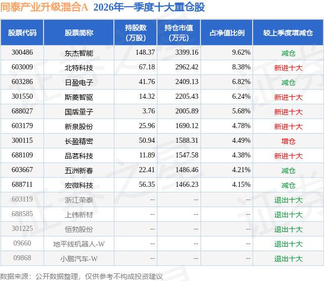 同泰产业升级混合A的前十大重仓股如下: