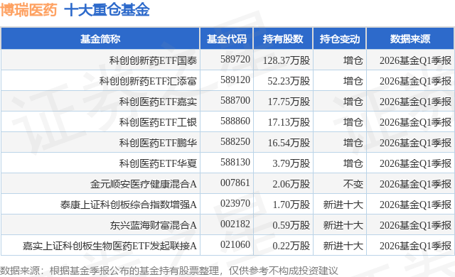 根据2026基金Q1季报公募基金重仓股数据,重仓该股的公募基金共10家,其中持有数量最多的公募基金为国泰基金的科创创新药ETF国泰。科创创新药ETF国泰目前规模为12.41亿元,最新净值0.9451(4月22日),较上一交易日上涨1.47%。该公募基金现任基金经理为麻绎文。麻绎文在任的基金产品包括:有色金属ETF国泰,管理时间为2023年8月8日至今,期间收益率为103.6%;矿业ETF国泰,管理时间为2023年8月8日至今,期间收益率为111.49%;中证2000ETF国泰,管理时间为2023年9月13日至今,期间收益率为55.0%;集成电路ETF国泰,管理时间为2023年10月11日至今,期间收益率为104.54%。
