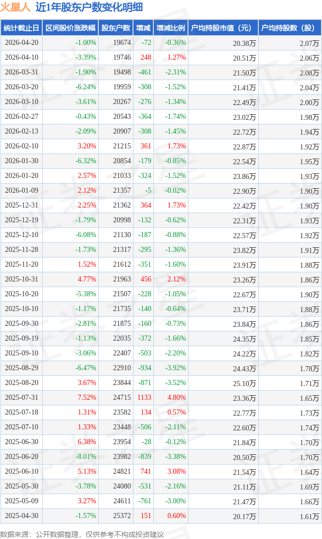 从股价来看,2026年4月10日至2026年4月20日,火星人区间跌幅为1.0%,在此期间股东户数减少72.0户,减幅为0.36%。