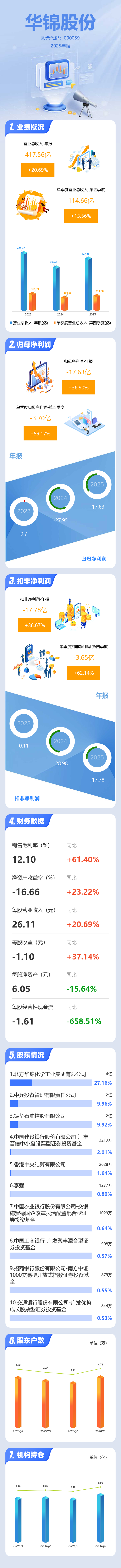 证券之星消息,华锦股份2025年年报显示,当年度公司主营收入417.56亿元,同比上升20.7%;归母净利润-17.63亿元,同比上升36.91%;扣非净利润-17.78亿元,同比上升38.67%;其中2025年第四季度,公司单季度主营收入114.66亿元,同比上升13.57%;单季度归母净利润-3.7亿元,同比上升59.17%;单季度扣非净利润-3.65亿元,同比上升62.15%;负债率58.29%,投资收益606.45万元,财务费用2.8亿元,毛利率12.1%。