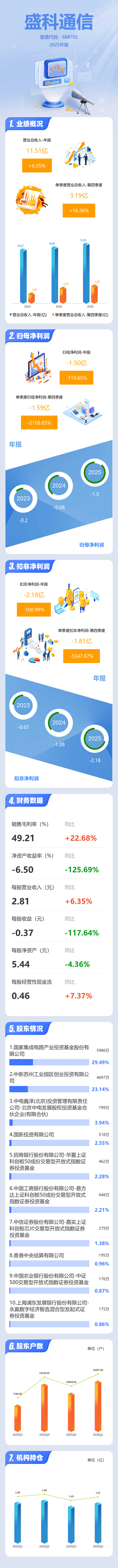 证券之星消息,盛科通信2025年年报显示,当年度公司主营收入11.51亿元,同比上升6.35%;归母净利润-1.5亿元,同比下降119.65%;扣非净利润-2.18亿元,同比下降101.0%;其中2025年第四季度,公司单季度主营收入3.19亿元,同比上升16.27%;单季度归母净利润-1.59亿元,同比下降2108.86%;单季度扣非净利润-1.81亿元,同比下降5547.67%;负债率11.95%,投资收益347.7万元,财务费用-464.37万元,毛利率49.21%。