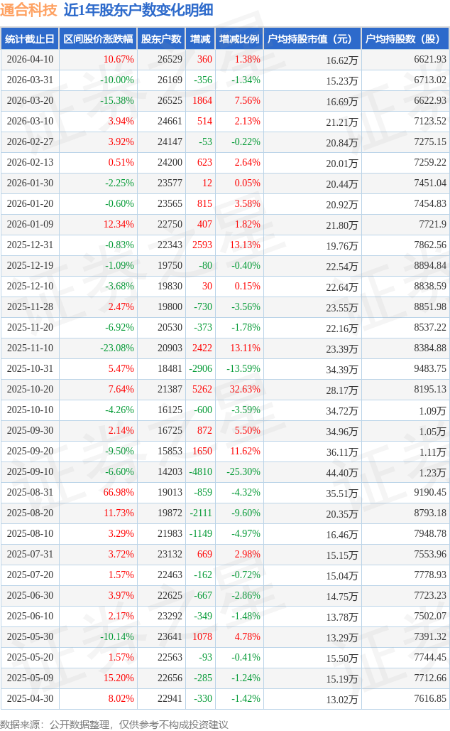 从股价来看,2026年3月31日至2026年4月10日,通合科技区间涨幅为10.67%,在此期间股东户数增加360.0户,增幅为1.38%。