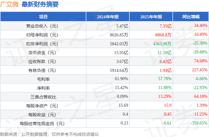 据证券之星公开数据整理,近期广立微(301095)发布2025年年报。截至本报告期末,公司营业总收入7.35亿元,同比上升34.4%,归母净利润8868.8万元,同比上升10.49%。按单季度数据看,第四季度营业总收入3.07亿元,同比上升18.39%,第四季度归母净利润5167.07万元,同比下降28.79%。本报告期广立微三费占比上升明显,财务费用、销售费用和管理费用总和占总营收同比增幅达64.18%。