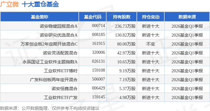 持有广立微最多的基金为诺安稳健回报混合A,目前规模为10.17亿元,最新净值2.467(4月23日),较上一交易日下跌2.68%,近一年上涨83.69%。该基金现任基金经理为邓心怡。