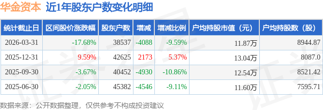 从股价来看,2025年12月31日至2026年3月31日,华金资本区间跌幅为17.68%,在此期间股东户数减少4088.0户,减幅为9.59%。