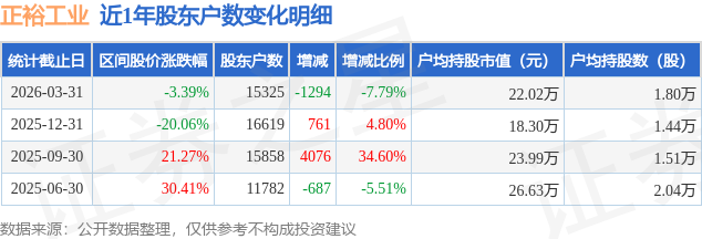 从股价来看,2025年12月31日至2026年3月31日,正裕工业区间跌幅为3.39%,在此期间股东户数减少1294.0户,减幅为7.79%。