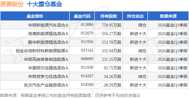 根据2026基金Q1季报公募基金重仓股数据,重仓该股的公募基金共8家,其中持有数量最多的公募基金为华商基金的华商新能源汽车混合A。华商新能源汽车混合A目前规模为5.54亿元,最新净值0.7885(4月22日),较上一交易日上涨0.14%,近一年上涨43.65%。该公募基金现任基金经理为陈夏琼。陈夏琼在任的基金产品包括:华商高端装备制造股票A,管理时间为2025年1月6日至今,期间收益率为186.61%;华商竞争力优选混合A,管理时间为2025年1月6日至今,期间收益率为107.59%;